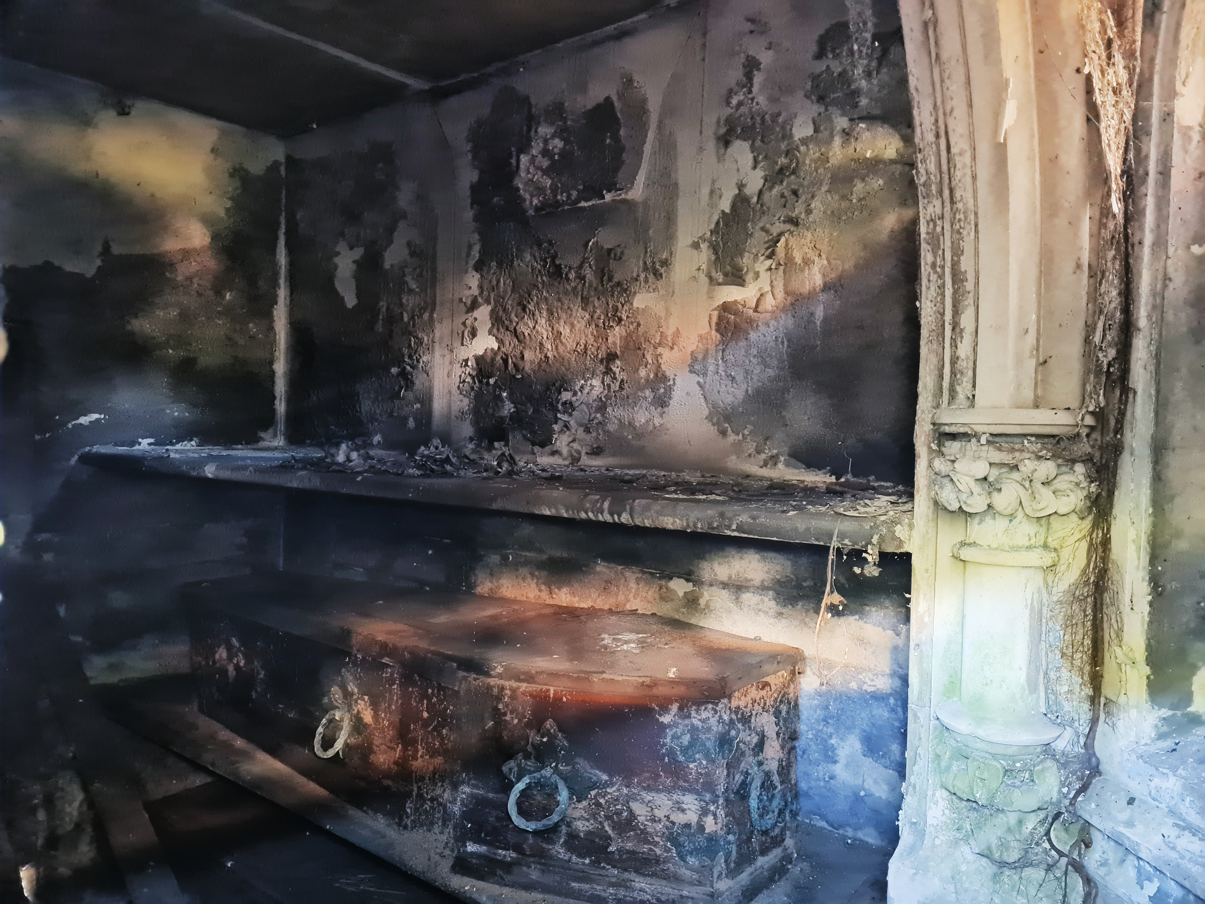 someone, possibly with the initials LL, “fucked here July 2000”. A cold stone floor, in the blackened inhospitable